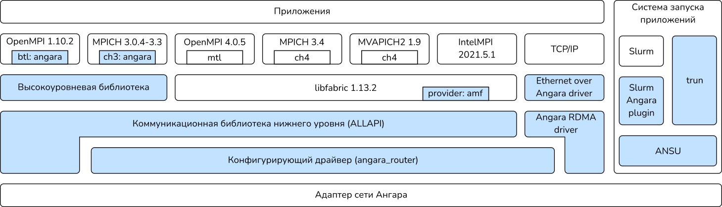Системное программное обеспечение сети Ангара позволяет предоставлять пользователям привычное программное стандартное окружение, скрывая детали реализации, обеспечивая при этом высокую производительность.